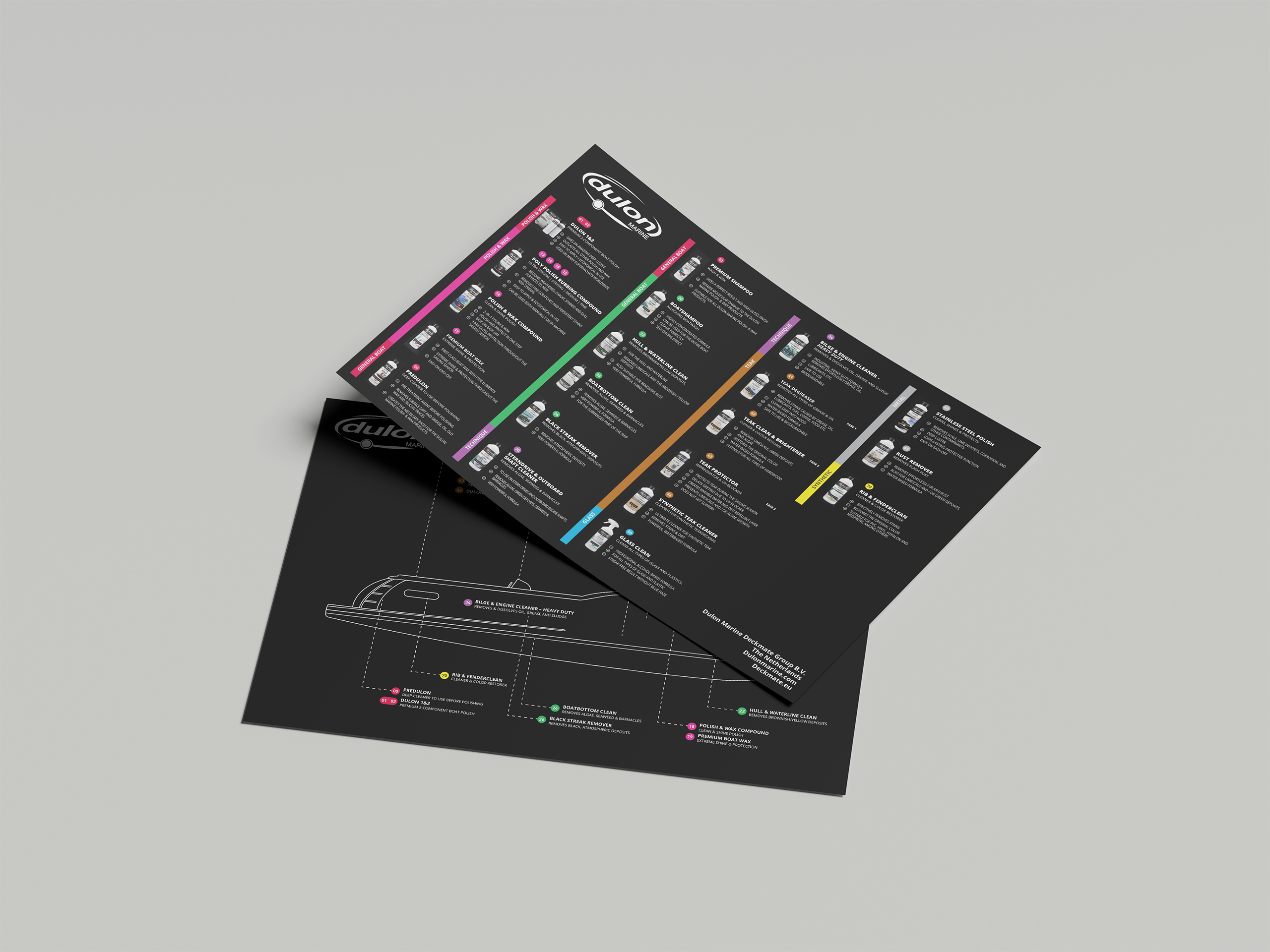 Dulon Marine is een toonaangevende speler in de wereldwijde branche van onderhoudsproducten voor plezierjachten en de beroepsvaart. Met een breed assortiment van kwalitatief hoogwaardige onderhoudsproducten, geschikt voor zowel particulier als professioneel gebruik, biedt Dulon Marine voor vrijwel iedere onderhoudsuitdaging aan boord een passende oplossing. Ze hebben momenteel 51 producten (met mijn verpakkingen en/of etiketten) en liggen in 33 verschillende landen in de schappen